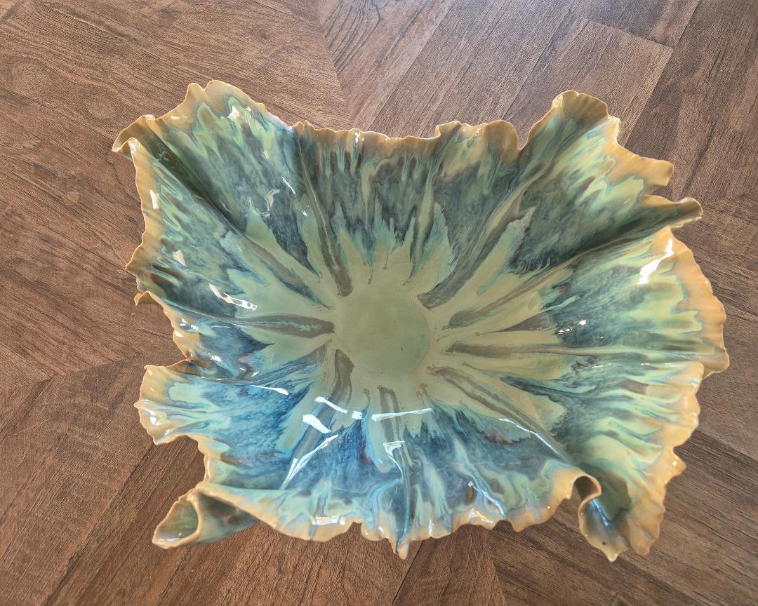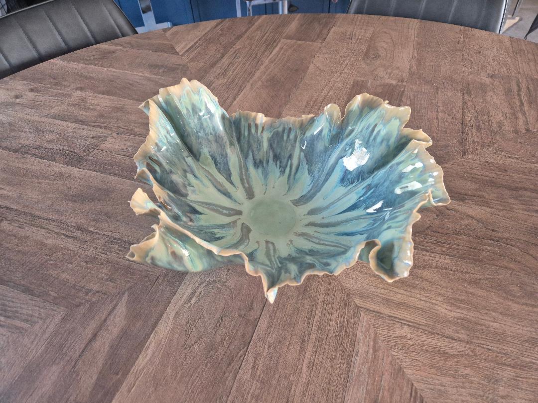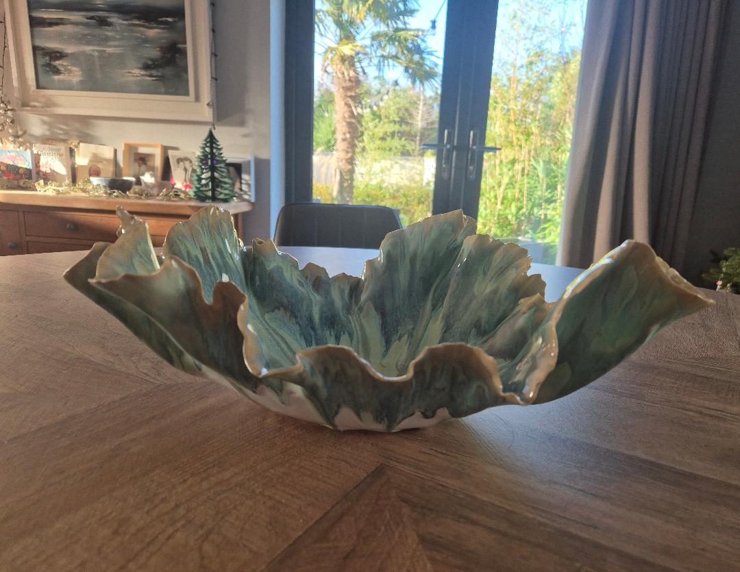 This scalloped bowl is beautifully finished in greens, creams, aqua and blue. The colours fall beautifully. A striking piece of work, making a very unique gift.