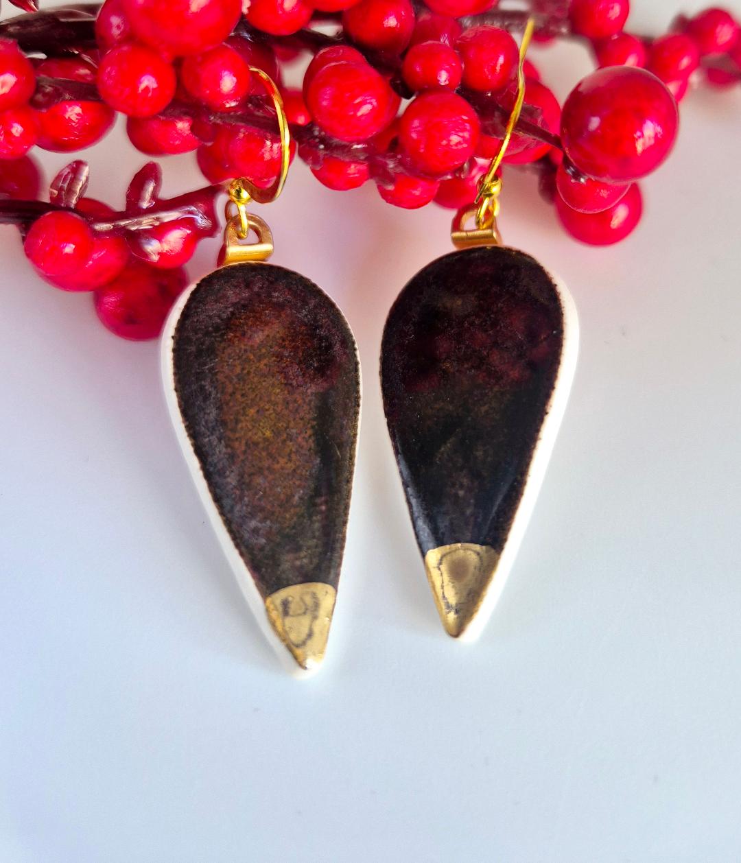 Handmade and designed in North County Dublin, these beautiful earring are a one of a kind item. Finished in Bronze glaze with 24k gold detailing. Gold plated and nickel free hooks.