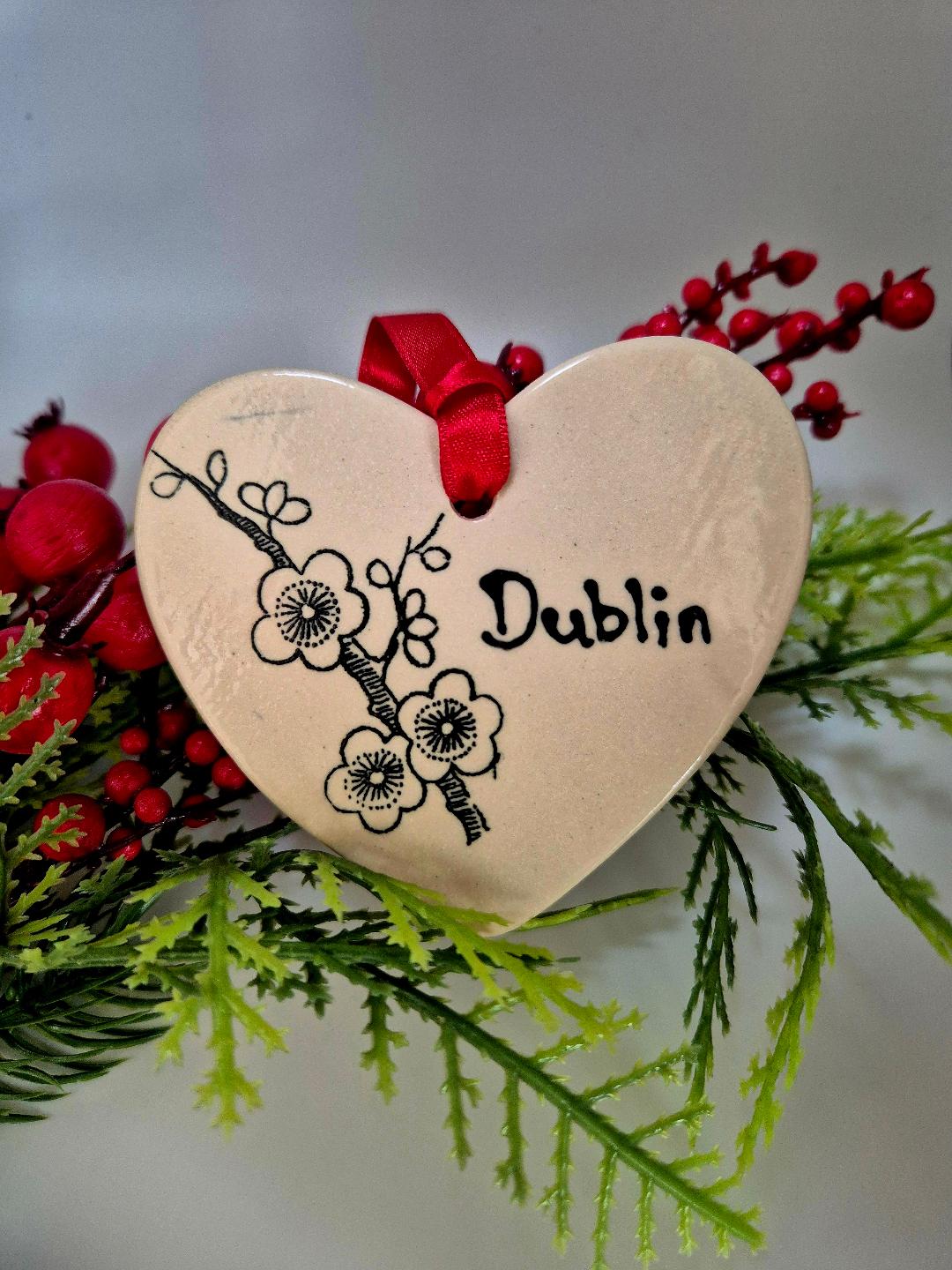 Dublin decorations Handmade ceramic item with red satin ribbon