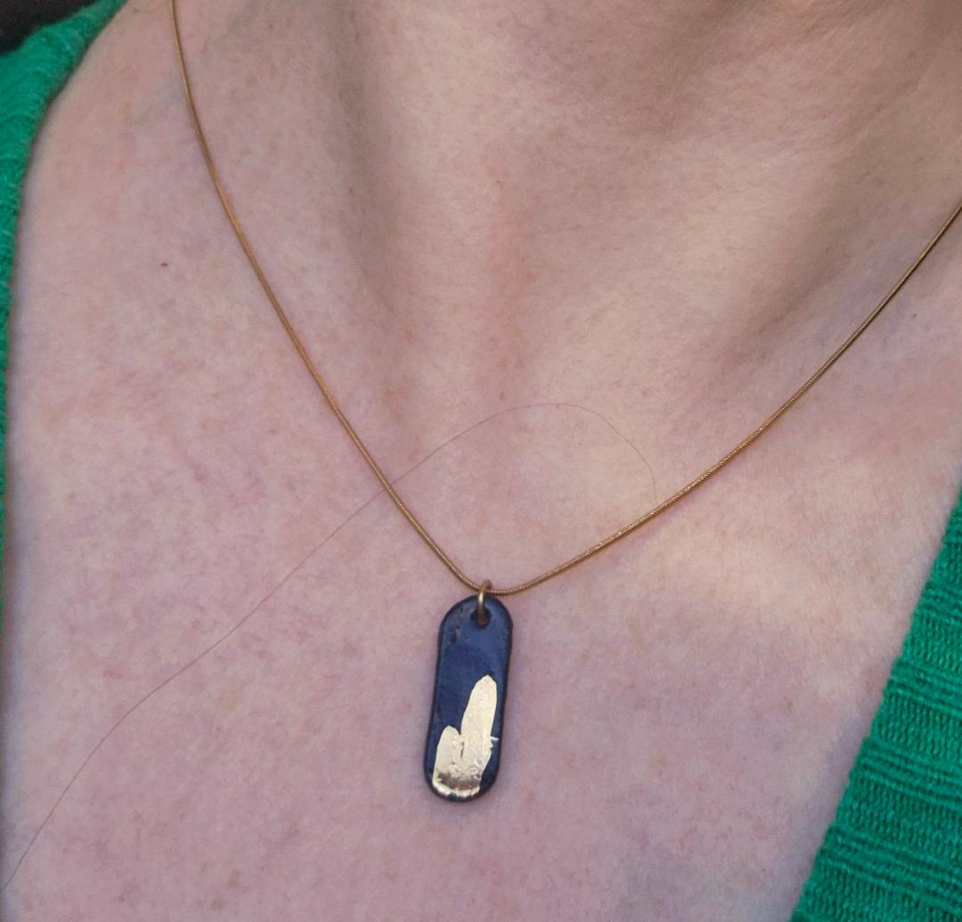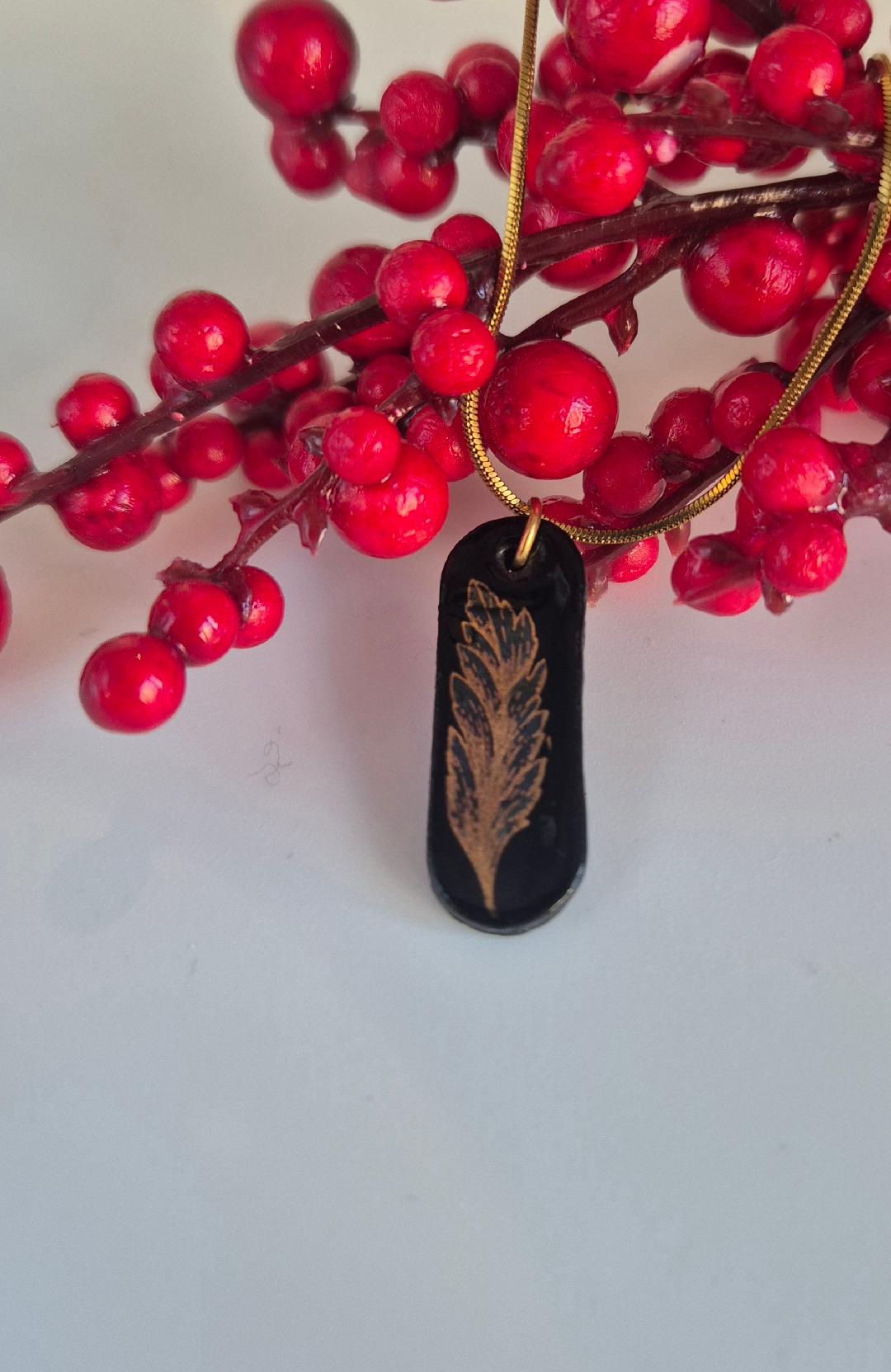 Elegant black piece with gold leaf accent finished with gold plated snake chain necklace