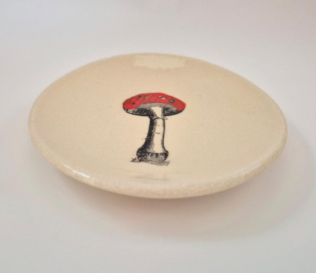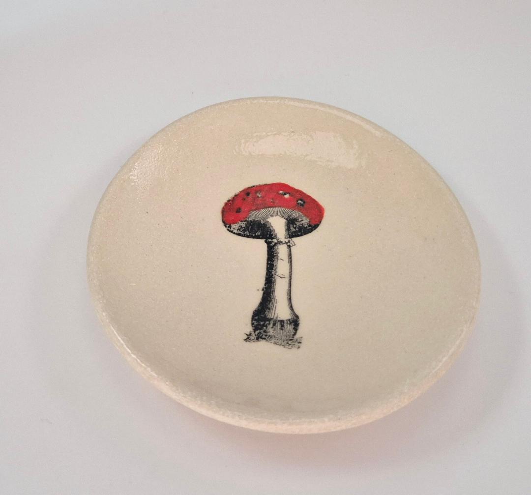 This beautiful little trinket dish is glazed in cream with mushroom detailing.